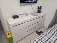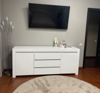 Вместительность, которая вас удивит: За каждой из распашных дверец скрывается вместительная полка, идеально подходящая для хранения вещей, которые вы хотите держать под рукой, но вне поля зрения. Три глубоких выдвижных ящика позволят организовать хранение белья, одежды или других предметов, обеспечивая легкий доступ к ним.