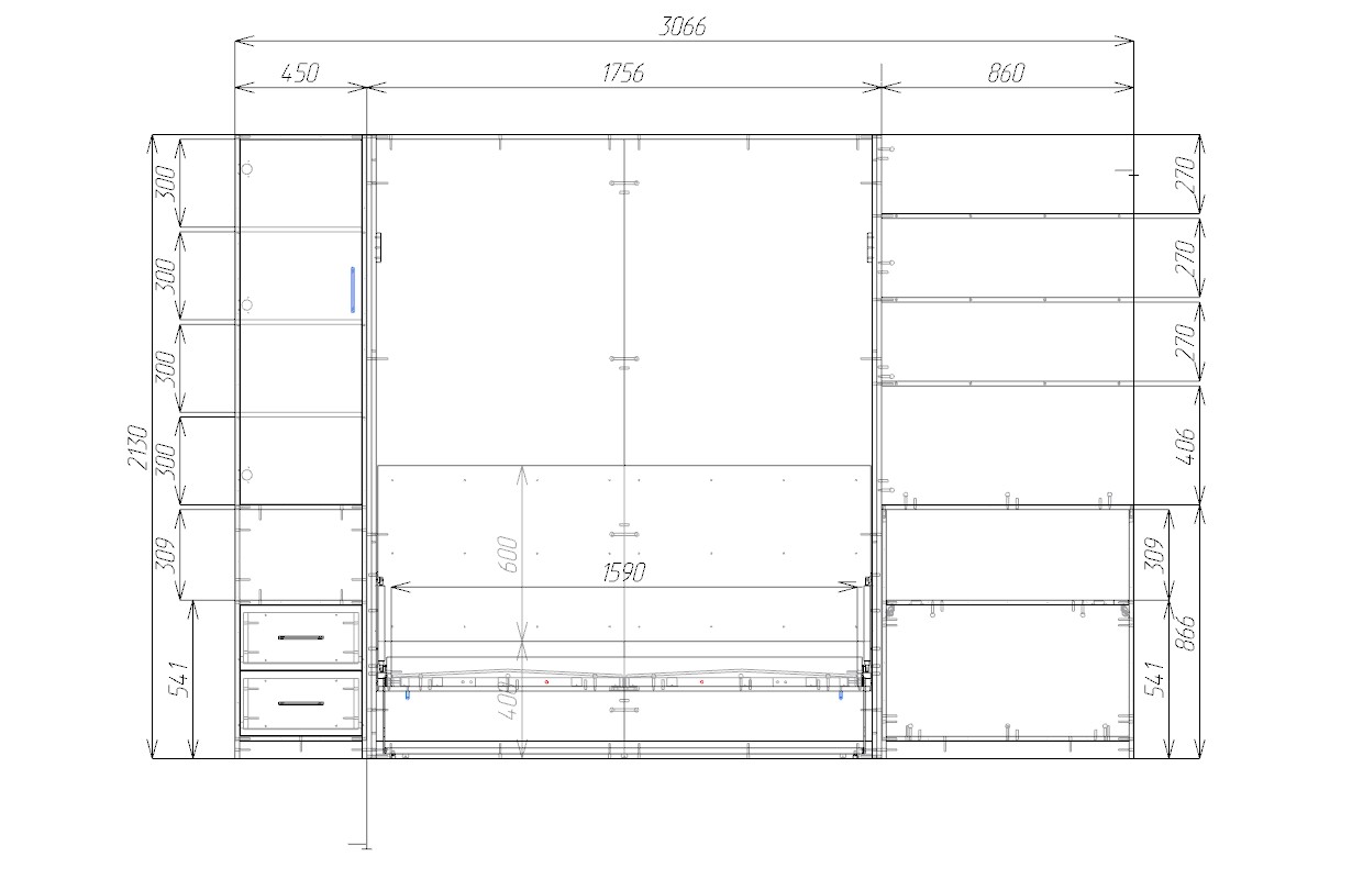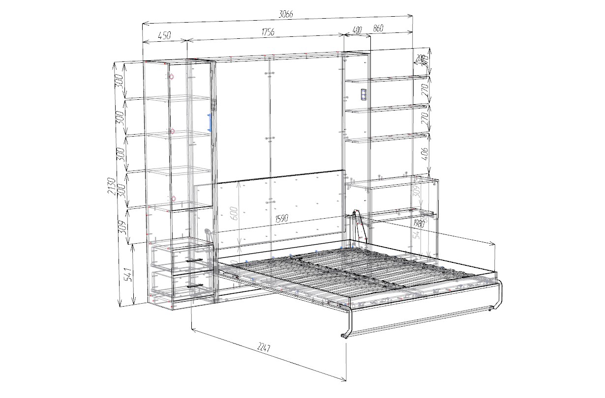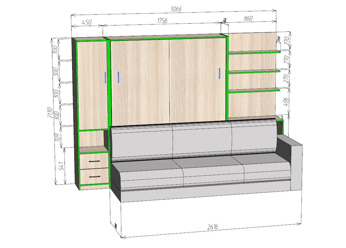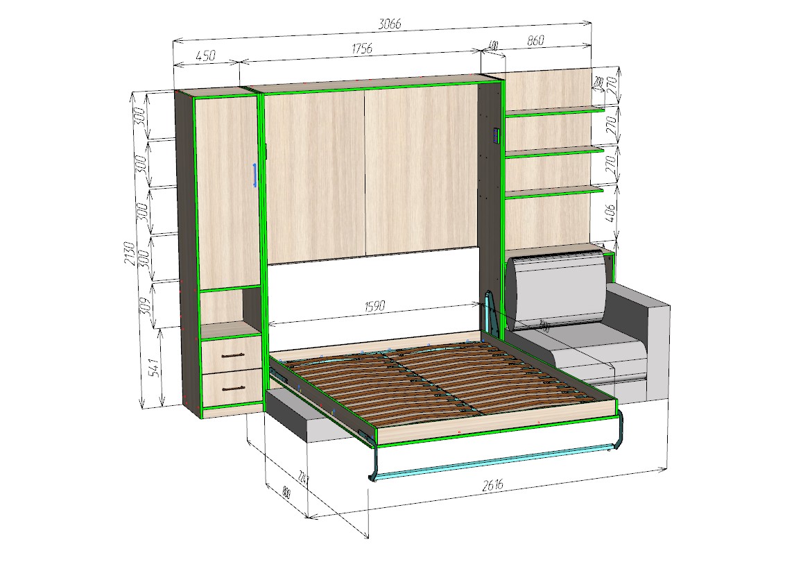 В сложенном виде композиция выглядит как функциональный шкаф с открытыми книжными полками, распашным отделением и выдвижными ящиками. Центральную часть дополняет удобный диван, который формирует комфортную зону для отдыха и приема гостей. При необходимости конструкция легко трансформируется, превращаясь в полноценную двуспальную кровать.