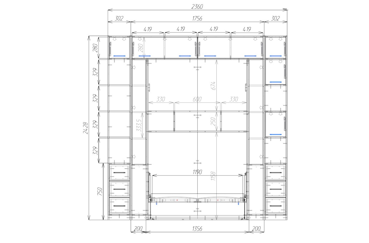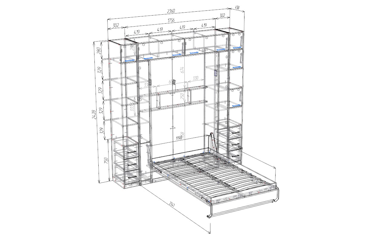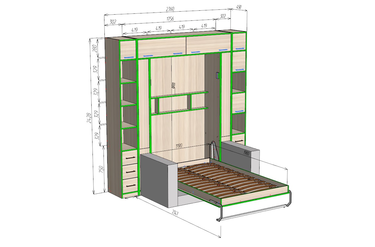 В центре конструкции скрыта вертикальная откидная кровать. Надежный механизм позволяет раскладывать ее плавно и без усилий, преобразуя комнату в полноценную спальню.