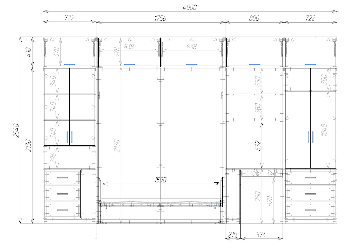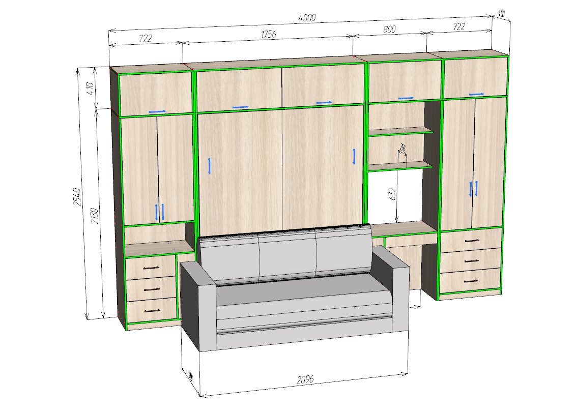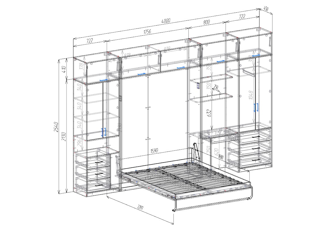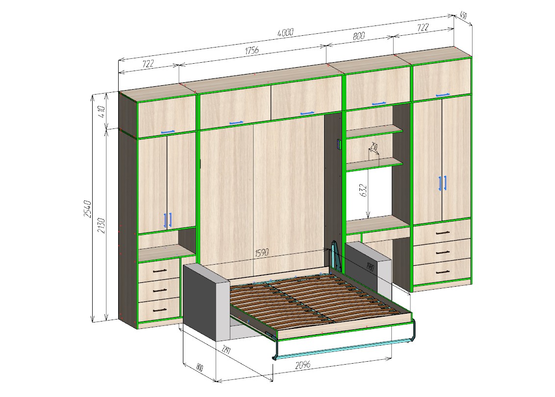 - Откидную двуспальную кровать размером 1600 × 2000 мм.