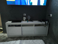 Центральное место занимают два удобных выдвижных ящика, идеально подходящих для хранения дисков, пультов дистанционного управления и других мелочей.