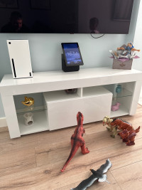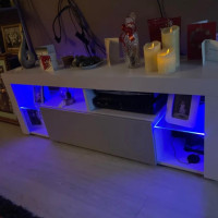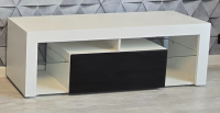 По бокам тумбы расположены две открытые стеклянные полки, которые придают ей легкости и воздушности. На этих полках можно разместить декоративные элементы, книги, или коллекции любимых фильмов, подчеркивая индивидуальность вашего интерьера.