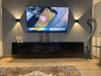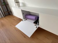 Внутри вы найдёте четыре вместительных отсека с откидными вниз дверцами на газлифтах. Они идеально подходят для хранения пультов ДУ, игровых приставок, дисков, кабелей и прочих мелочей, поддерживая порядок и чистоту в вашей гостиной. Провода можно аккуратно спрятать за задней стенкой тумбы, чтобы избежать спутанного кабельного "хаоса".